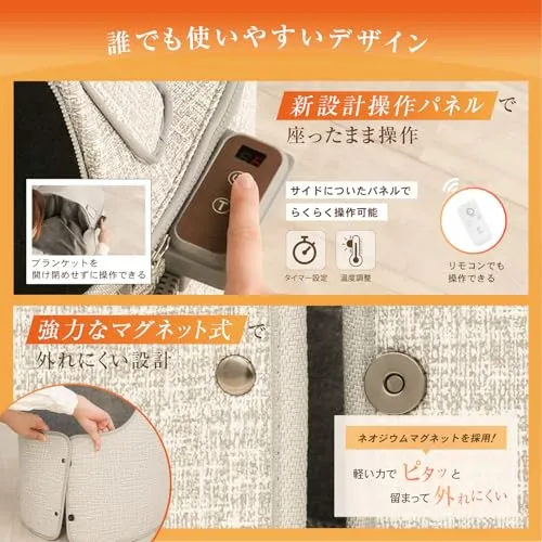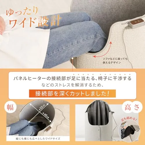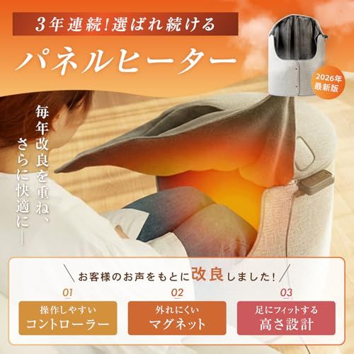 【2026年版】今年のパネルヒーターはお客様の声をもとにさらに使いやすく改良しました。 ?操作しやすい操作パネル:操作パネルが足元にあって見えにくいというお声をいただき、今年はサイドに操作パネルを設置。見やすく座ったまま熱を逃さずに操作可能です。 ?邪魔にならない高さ:ふくらはぎに当たってしまう、ソファだと足に