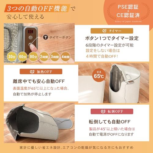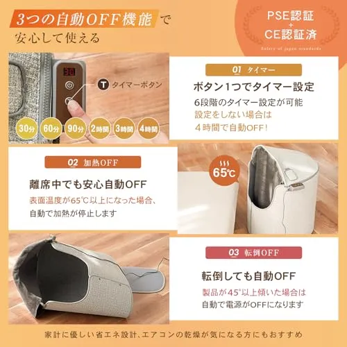 【3つの安心・安全設計】「過熱防止機能」表面温度が65以上になった場合、徐堂で過熱を停止します。「転倒時自動オフ機能」製品が45以上傾いた場合、電源が自動でオフに切り替わります。「つけっぱなし防止機能」4時間以上電源が入りっぱなしの時は自動で電源がオフになります。電源切り忘れ、やけどなどを防止する安心・安全設計です。