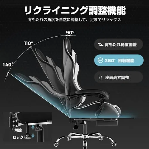 【想像以上の145リクライニング】最大145のリクライニング機能を搭載しており、快適に寝転がりながら使用できます。この角度は広めで、寝ながらスマートフォンを使ったり、読書やドラマ鑑賞を楽しむのに最適です。また、角度が大きすぎると倒れるリスクがありますが、このチェアはその問題をしっかり解決し、安全に使用できます。