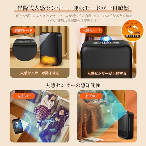 【人感センサー付き、人の動きを検知します】人感センサーONで、上下90、左右70の広い範囲で、2m離れても全身ぽかぽかを感じてきます。セラミックフヒーターは人とペットを検知せず5分以上経過すると、運転を停止して主電源が切れます、省エネな温度設定機能があるな電気ヒーターです。人/ペットの動きを検知すると運転が再開します。運転を停止している間は、暖房器具の人感センサ一ランプが点滅します。