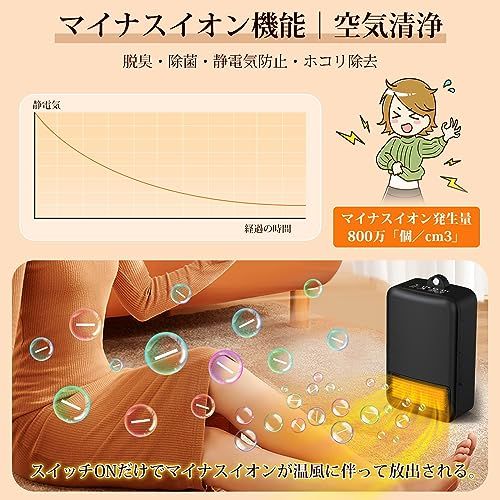 【温風とマイナスイオンで、快適な環境を作り出す 】冬季は暖房による乾燥や静電気でお困りではありませんか?このセラミックヒーター、空気のうるおいを守るマイナスイオン機能を搭載。温風とともにマイナスイオンを放出し、お部屋の空気を浄化。ホコリや花粉などを鎮静化し、不快な静電気の発生を抑えます。乾燥しがちな冬の室内でも、しっとりと快適な空気環境をつくり出し、肌や喉への負担を軽減。暖かさと快適な空気品質の両立を実現する、冬の新習慣となる一台です。