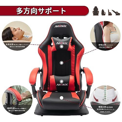 NIONIK ゲーミングチェア 座椅子 ゲーミング座椅子 180°リクライニング 高反発座面 ハイバック 連動アームレスト ランバーサポート 360°回転座面 PUレザー 座椅型ゲーミングチェア(ブラック&レッド)/