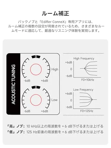 【ルーム補正】バックノブと「Edifier ConneX」専用アプリには、ルーム補正の複数の設定が用意されているため、さまざまなルームモードに適応して、最適なリスニング体験を実現します。