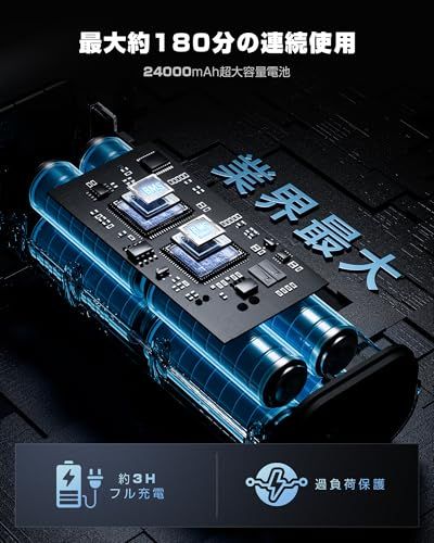 【24000mAh超大型バッテリー搭載&BMS バッテリー保護】KOJIHOMU エアダスターは 24,000mAh 大容量リチウムバッテリーを搭載し、わずか 3 時間の急速充電で最大 180 分連続使用可能!PSE 認証取得済みの高品質製品で、専門工場の厳格な品質管理により使用が保障されます。搭載した BMS バッテリー保護システムは、バッテリーの状態をリアルタイム監視。過充電、過熱、過放電などのリスクを徹底防止し、製品の使用効率と安全性を両立させ、長期間にわたり安定した性能を発揮させます!