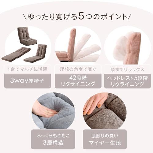 【スタッフのおすすめポイント!】 ・シーンに合わせてスタイルチェンジ!3way座椅子 座椅子・カウチ・ベッドにスタイルチェンジ ・大人かわいいニュアンスカラー ・もこもこキルティングで座り心地 ・リクライニング42段階ヘッドリクライニング5段階 ・高い品質と耐久力を誇る日本メーカーのギア使用 ・肌触りの良いマイヤー生地 ・折り畳み収納OK