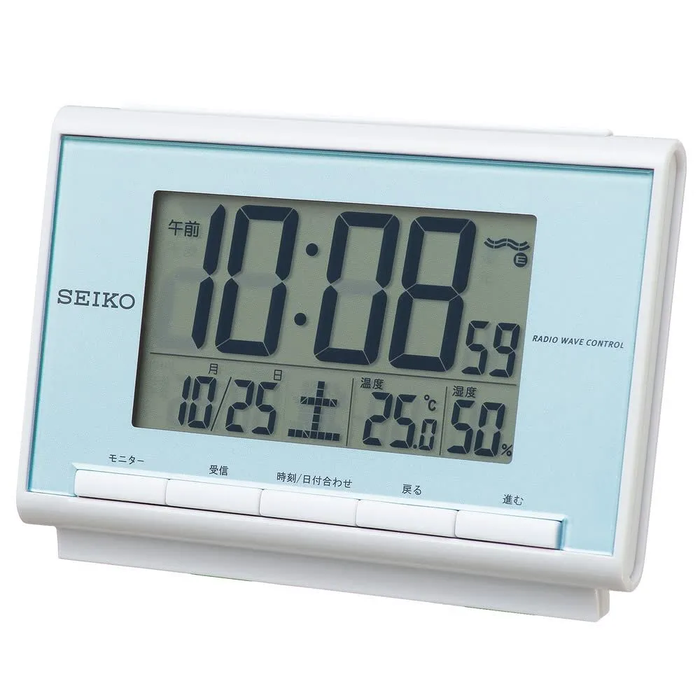 Clock) セイコー セイコークロック(Seiko クロック 目覚まし時計 電波 デジタル カレンダー 温度 湿度 表示 薄青 パール SQ698L SEIKO