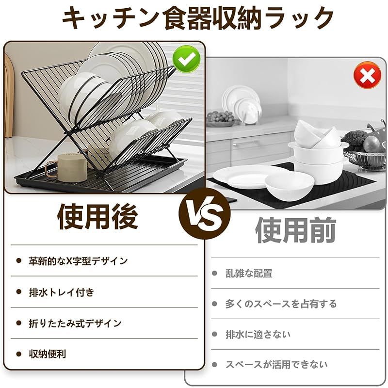 【安定性 】-- X字型のデザインにより安定性が向上し、使用時に転倒したりバラバラになったりする心配がありません。三角形のブラケット原理により安定しており、揺れず、より多くの重量に耐えます。ディッシュラックの各段には、食器を収納するための22個のスロットがあります。上段にはディナープレートがぴったり収まり、下段にはマグカップ、フライパン、他の小物類を収納できます。