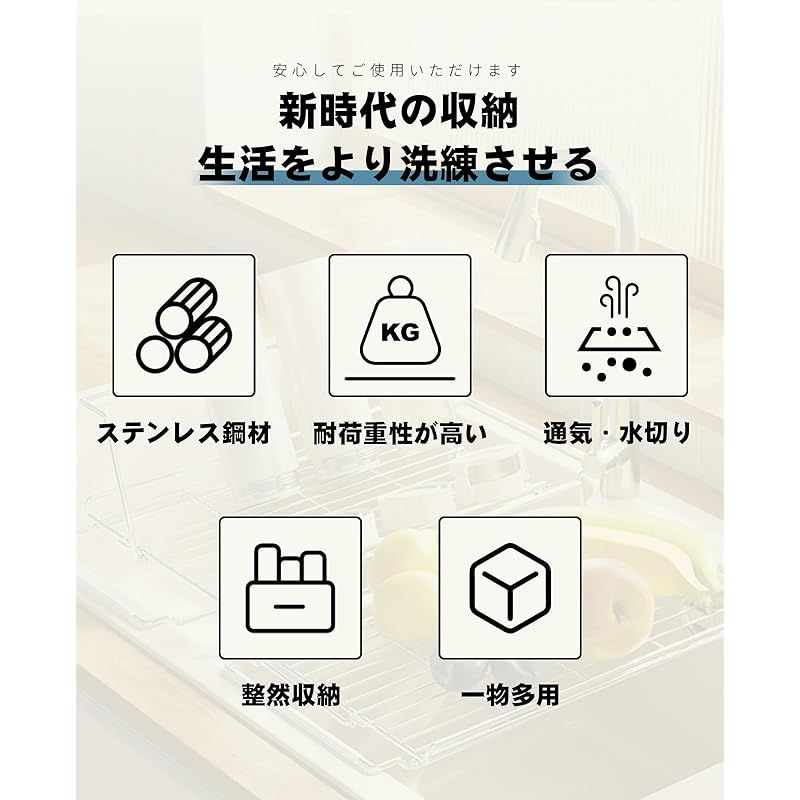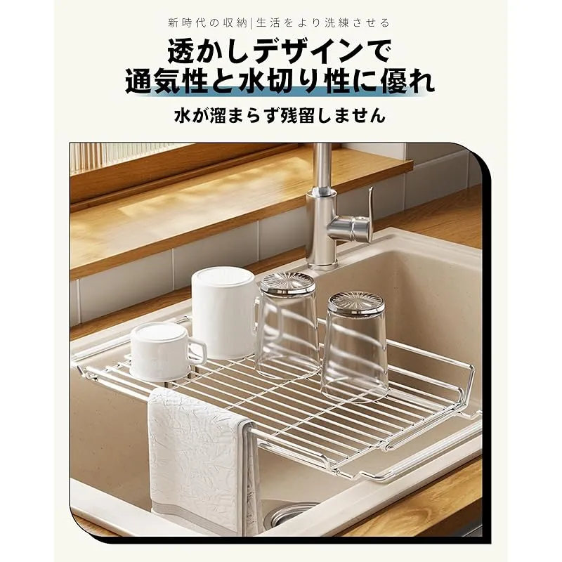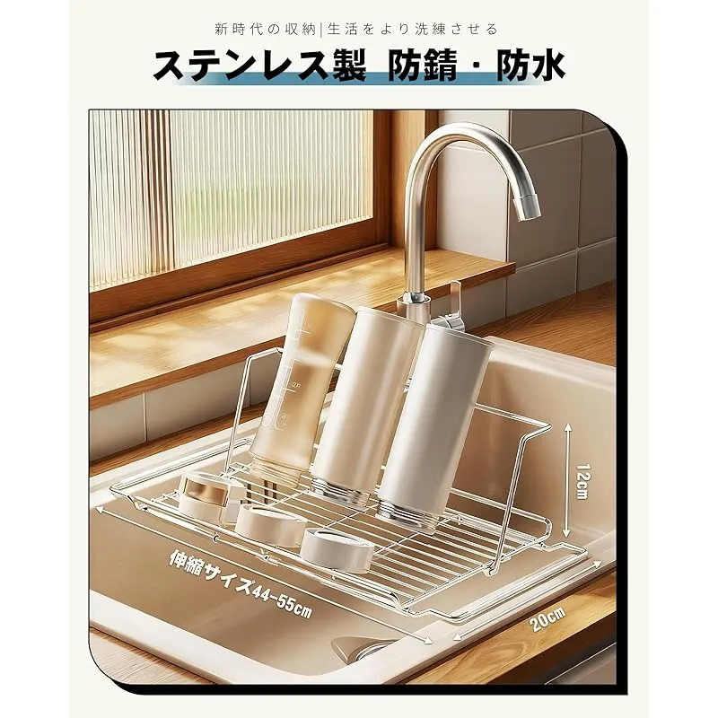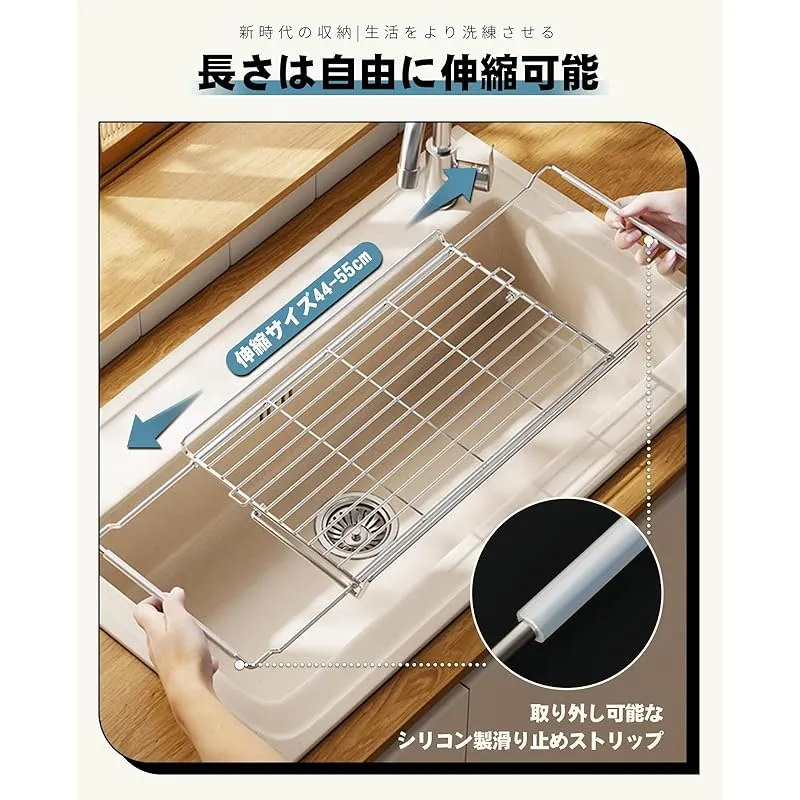 【商品説明】 狭いキッチンでも作業スペースをしっかり確保できる、伸縮式44?55cmのステンレス製水切りラックです。シンクに渡して置くだけで簡単に設置でき、シンク上でもカウンター上でも使える2WAY仕様。賃貸マンションやワンルームなど、限られたスペースのキッチンに最適です。 高品質ステンレスを採用し、錆びにくく耐荷重10kgで鍋やフライパンも安定して置くことができます。滑り止めラバーがシンクを傷つけず、ラックがガタつかずにしっかり固定されるので、日常使いでも安心。ミニマル構造で水が溜まりにくく乾きが早いため、ぬめりやカビが発生しにくく衛生的です。 食器、カップ、調理器具、果物、野菜などの水切りに対応し、毎日の家事を快適にサポート。使用後はサッと水洗いし拭くだけでキレイになり、メンテナンスも簡単。キッチンの整理整頓にも役立つ、省スペースで万能なキッチンアイテムです。