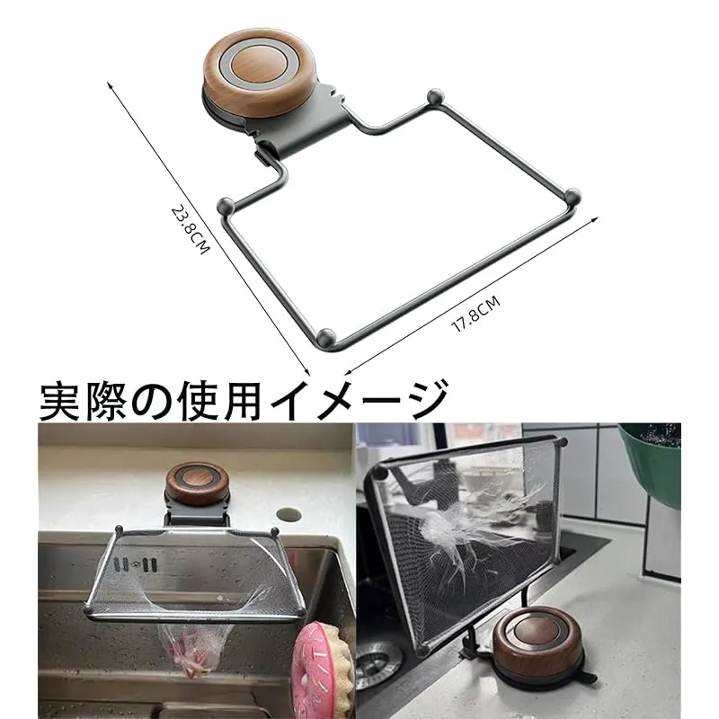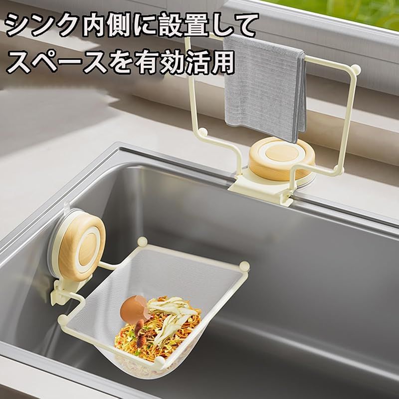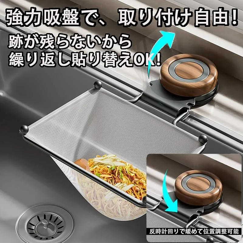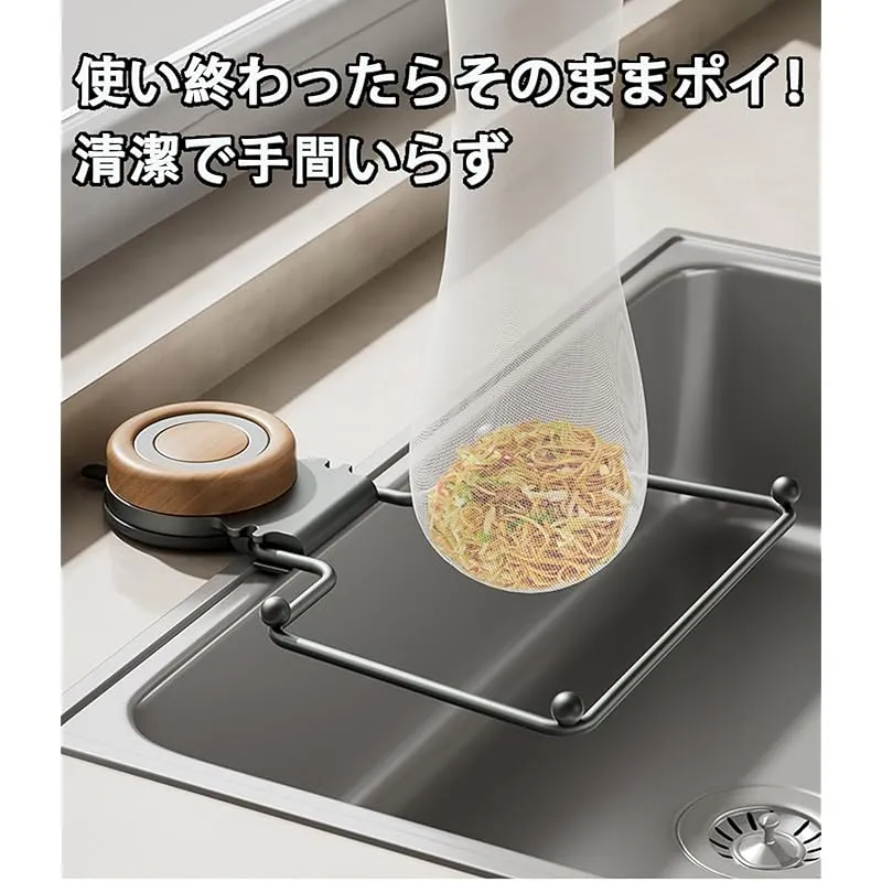 【商品説明】 強力吸盤でしっかり固定され、優れた耐荷重性を備えています。設置はとても簡単で、貼り直しても跡が残らず、好きな位置に付け替え可能です。シンクの内側にも設置できるため、スペースを無駄なく活用できます。さらに、使い捨てタイプの水切りネットが50枚付属しており、とても便利です。