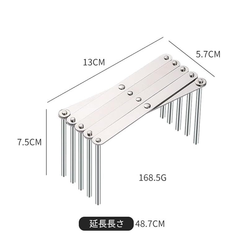 【商品概要】 製品サイズ:13*5.7*7.5cm、伸長後の長さ48.7cm。製品素材:ステンレス製。 伸縮式フレーム、引っ張るだけで数秒で蒸し器ラックに変身:厚みのあるステンレス鋼を使用してX字型のクロス伸縮式構造を作り、伸縮長さは13?48.7cmで自由に調整でき、変形することなく重量に耐えることができます。 縮めると手のひらサイズになり、壁に掛けたり引き出しに詰め込んだりできるので、狭いキッチンの収納アイテムとして最適です。 3 in 1 の多機能設計により、あらゆるキッチンのシナリオが可能になります。展開すると、蒸し器パッドまたはパン蒸しラックとして使用できます。折りたたむと、断熱や火傷防止のための鍋敷きとして使用でき、さまざまな鍋の曲面に適しています。逆さまに吊るすと壁のスパイスラックに変身します。幅広の滑り止めシリコン製フットパッドにより、置いたアイテムが安定し、倒れることはありません。 お手入れ簡単:電解研磨技術によりナノレベルの滑らかな表面を実現し、一度の水洗いで油汚れを洗い流すことができ、食器洗い機で繰り返し洗っても錆びません。