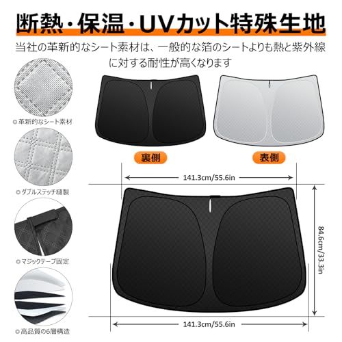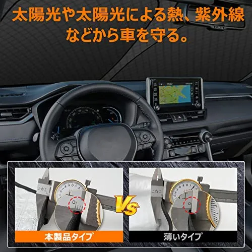 【強化版6層構造&次世代の特殊生地】1層目:高品質高密度アルミ遮熱シート、2層目:高品質高密度アルミ遮熱シート、3層目:ポリウレタン断熱素材、4層目:ポリウレタン断熱素材、5層目:高品質高密度アルミ遮熱シート、6層目:ポリウレタン断熱素材。洗練されたスタイリッシュなシルバー面、太陽光を強烈にはね返します。普通のサンシェードは材質が薄く、遮光性が弱い。本製品は厚い銀生地が採用され、遮光率がアップ。なお、普通のは銀色の面が内装と擦れる事で内装に色写りします。