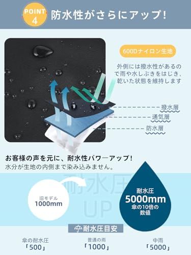 【防水・耐久性が更にアップ】本体生地は耐久性に優れた600Dナイロンが採用されて、2.7mmの厚さは従来のレインカバーより耐久性が更にアップ!高品質の生地を採用しているほか、耐水圧加工(5000mm)も施されているので、水分が生地の内側まで染み込みません。