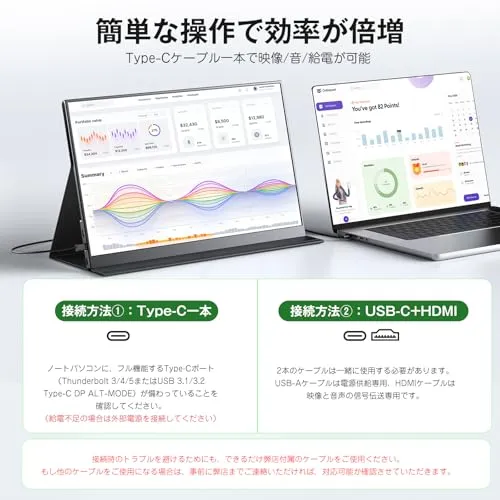 【ケーブル1本で画面信号と給電可能】USB Type-Cケーブル1本で画面信号と給電が可能です。USB Type-Cディスプレイ給電に対応しており、電源コンセントが不要なので、どこでも利用できます。さらに、Mini HDMI端子も搭載されており、スクリーン拡張や映像出力にも対応しています。専用ドライバーも不要で、購入後すぐに使用できます。注意:デバイスに接続するには、Type-C3.1又はThunderbolt3/4のフル機能のポートをサポートするのが必須です。給電不足の場合は5v/3Aの外部電源を接続してください。電源アダプターは付属されません。※iPhone接続:iPhone 15 Pro / Pro Max 以降は直接接続可(USB 3.0)。iPhone 15 / 15 Plus / 16 / 16e / 17 / iPhone Air は映像出力非対応(USB 2.0)、接続できません。iPhone 14以前はLightning?HDMI変換アダプターが必要です。