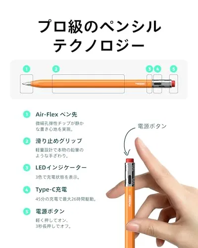 【最長26時間使用&2倍速充電】 Air 8 Pro Xは約45分でフル充電が完了し、最大26時間の連続使用が可能です。わずか5分の充電で約4時間使用できる高効率設計。業界最長クラスのバッテリー持続時間と高速充電を実現し、バッテリー切れの心配がありません。 (※USB-C to Cケーブルで充電。磁気吸着充電には非対応。iPadケースに貼り付けできるペンホルダー付き。)