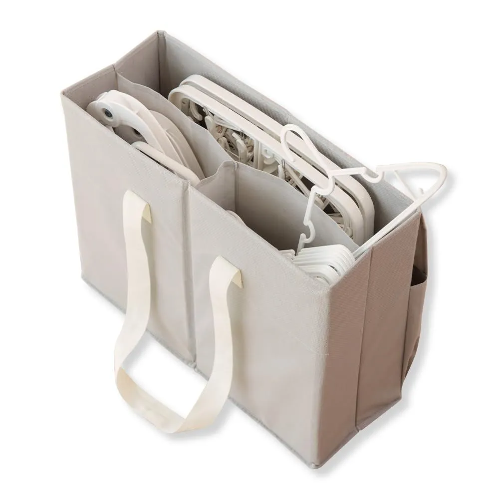 【商品仕様】商品サイズ/(約)50×18×40cm(持ち手含まず)、収納目安/ピンチハンガー・ハンガー各種・ふとんハンガー・洗濯ネット等を分けて収納、材質/本体:ポリプロピレン不織布・持ち手部:ポリプロピレン・中材:厚紙