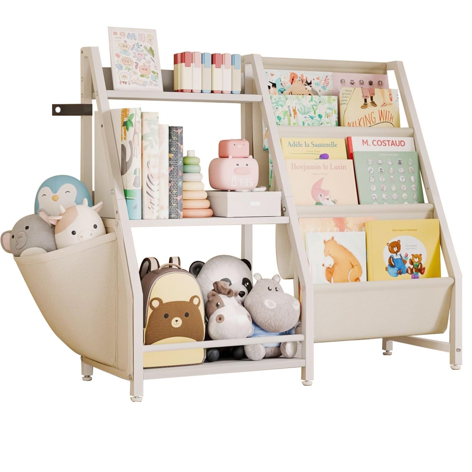【お子様の“はじめての本棚”にぴったり】高さ75cmのキッズ用絵本ラックは、お子様の目線に合わせた設計で、絵本の取り出しやすさ抜群。不織布×鉄パイプの3段ポケットで、お気に入りの絵本を楽しく収納できます。