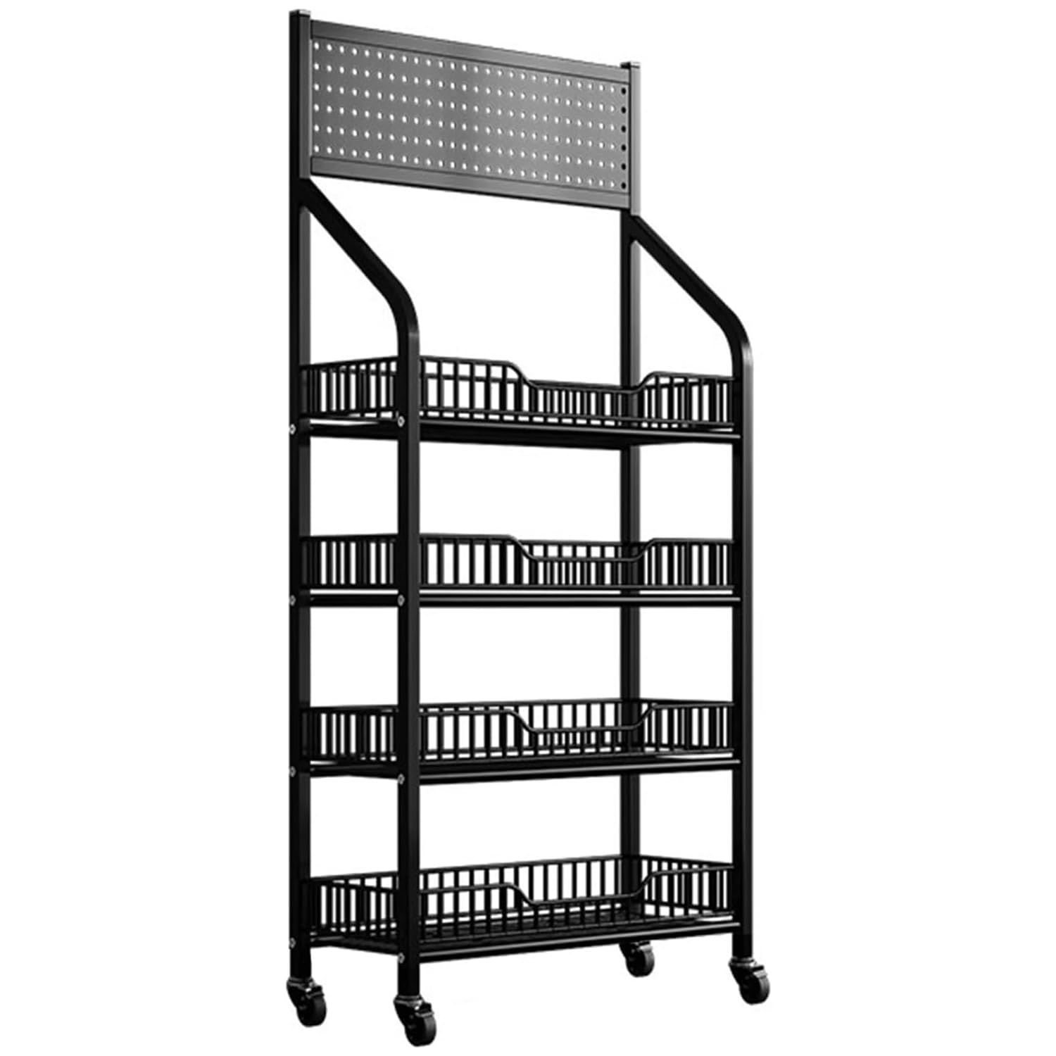 スチールラック スーパーの棚 キッチンラック 収納ラック 壁に向かって スーパーマーケットの棚キャビネット キャスター付き サイズ:60x25.5x145CM 省スペース 頑丈 パントリー、スーパー、戸棚、浴室 小物 掃除しやすい 丈夫な構造 多機能 おしゃれ 4つのワイヤーバスケットが付いてい ブラック