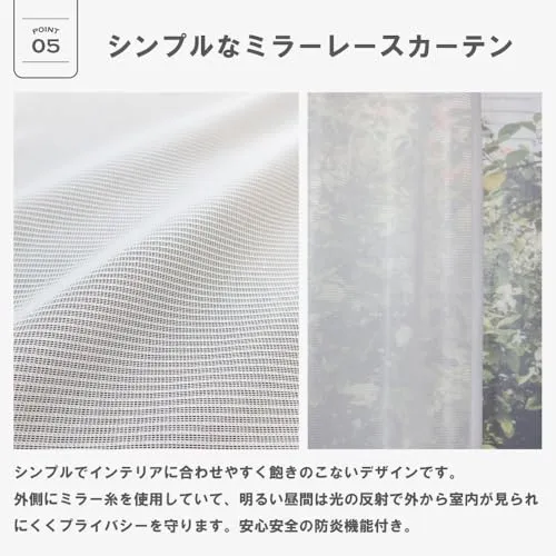 【レースカーテン】防炎機能とミラー機能があるレースカーテンがセットになります。シンプルな無地タイプで昼間は外から見えにくく、プライバシーを守ります。なお、ドレープカーテンよりも2cm短い丈になります。