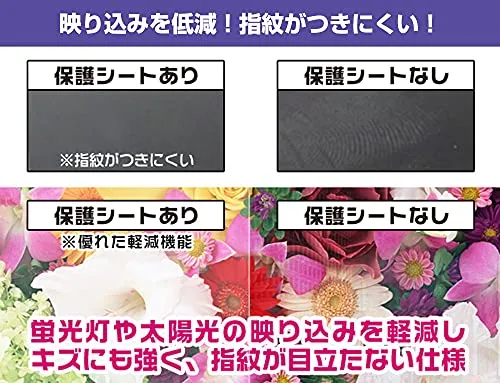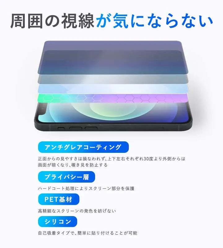 上下左右、それぞれ30度ずつ、覗き見防止効果があります。シート表面にアンチグレア(低反射)処理を施し、画面への映り込みを低減します。 サラサラとした手触りで指紋もつきにくく、指やタッチペンの操作性も抜群です。 また、アンチグレア(低反射)処理によって、蛍光灯や太陽光の画面への映り込みを軽減し、屋外の使用でも画面を見やすくします。