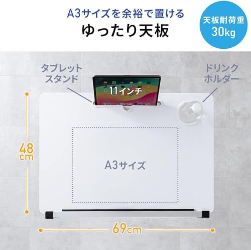 天板サイズは、約幅69cm、奥行48cmになり、A3サイズを余裕で置けるサイズ感です。組立不要で届いたらすぐに使うことができます。