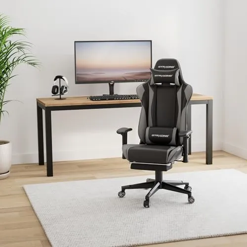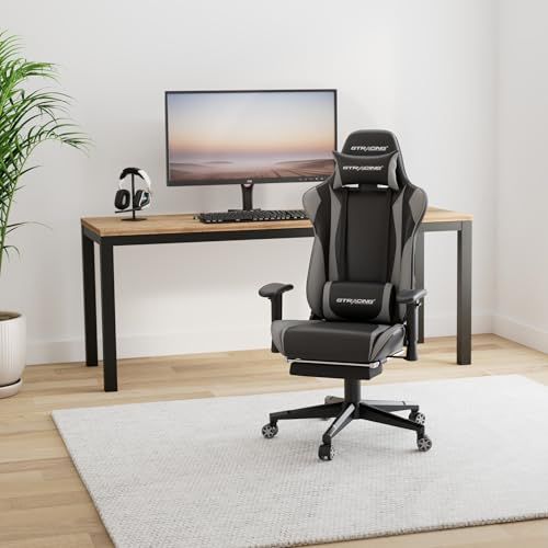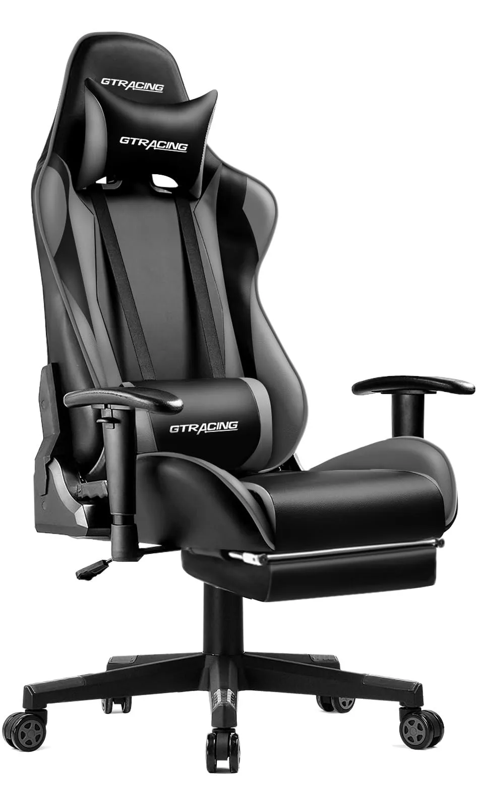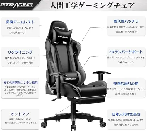 GTRacingゲーミングチェア オフィスチェア デスクチェア ゲーム用チェア リクライニング パソコンチェア ハイバック ヘッドレスト ランバーサポート ひじ掛け付き 高さ調整機能 PUレザー オットマン付き (GT002F-GRAY)/