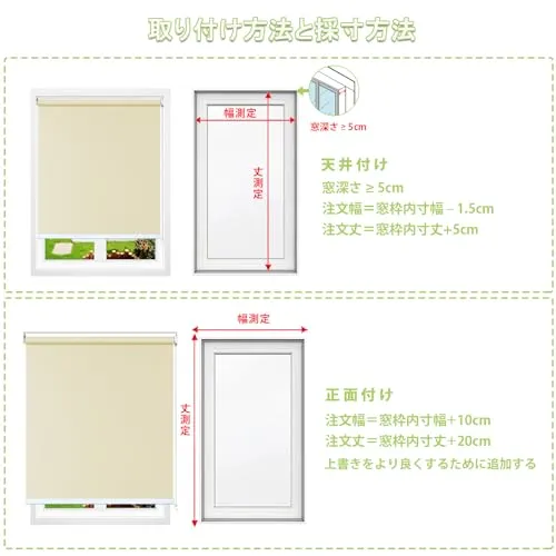 【採寸方法】正面付け:注文幅=窓幅+10cm、注文丈=窓丈+20cm。天井付け:注文幅=窓幅-1.5cm、注文丈=窓丈+5cm、窓深さ?5cm。注文範囲は:幅30~230cm/丈?300cm。ロールスクリーンは製品幅よりも生地幅が狭い、どうぞご了承ください。生地のみ希望の方、当店と連絡してください。 ★