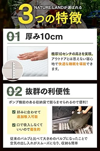 【キャンプインストラクター推薦】NATURE LAND キャンプ マット 極厚 10cm インフレーターマット エアーマット ポンプ機能付き 防災 防災グッズ/