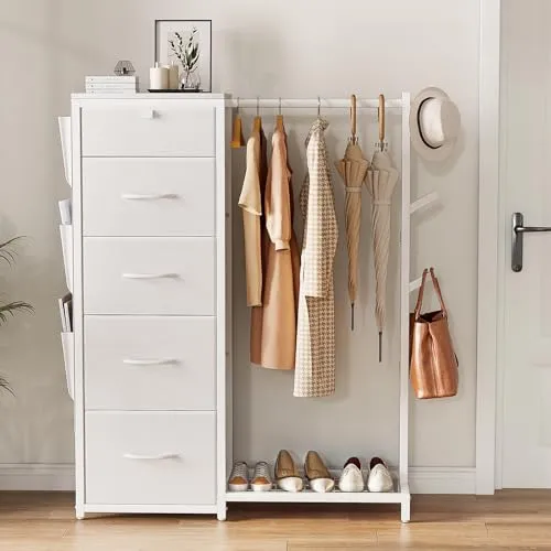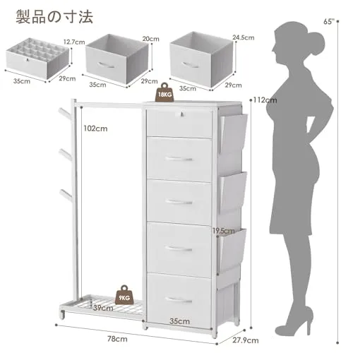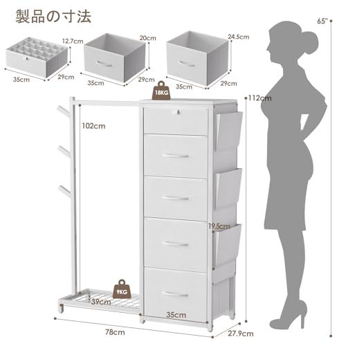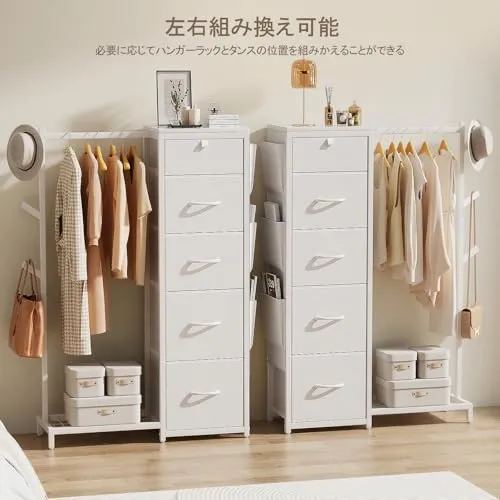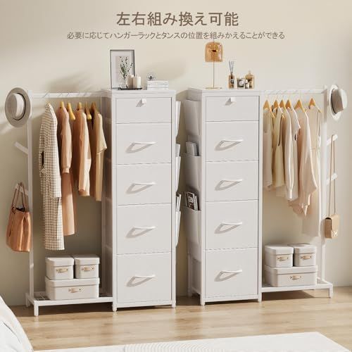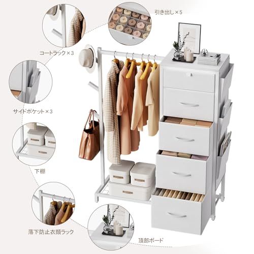 Luxspire ハンガーラック 引き出し付き ハンガーラック 棚付き ワードローブ タンス 収納 帽子掛け カバン掛け 洋服ラック チェスト5段 側面ポケット 左右組み換え可能 衣類収納 丈長めコート 下着収納 整理整頓 頑丈 組立簡単 日本語取扱説明書付/