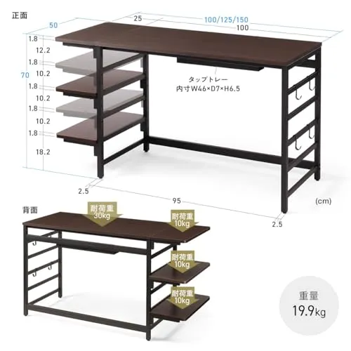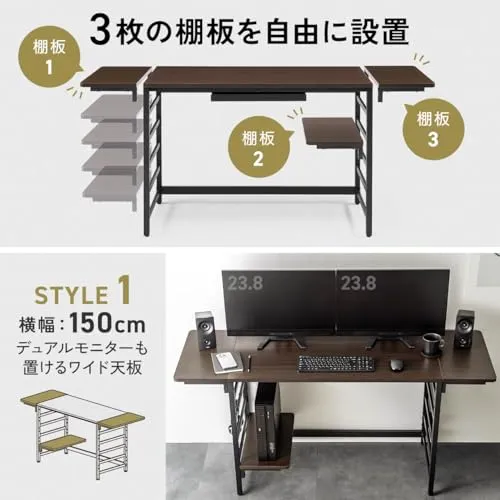 棚は3枚付属しており、天板の 拡張 や本などを置く棚として位置や高さを設定できます。