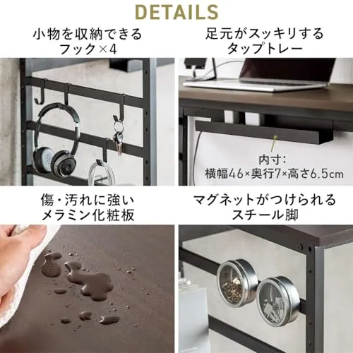 天板は耐荷重30kgで、総耐荷重は60kgです。小物 などをかけることができるフックが4つ付いています。