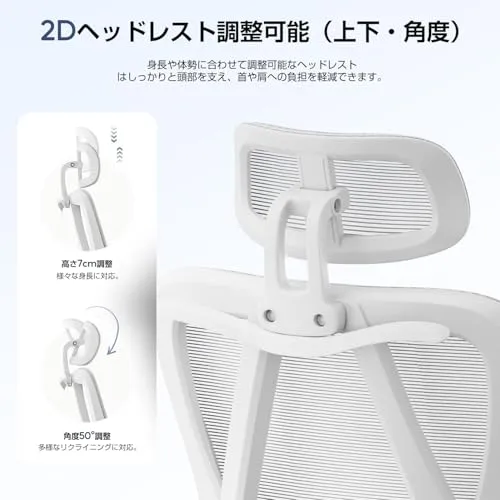 【多機能ランバーサポート&調節可能ヘッドレスト】 腰クッションは上下・前後の調節が可能で、異なる体型や好みに合わせてサポート力を調整できます。頭部を支えるヘッドレストも上下&角度調節に対応し、正しい姿勢を促し頸椎への負担を軽減します。