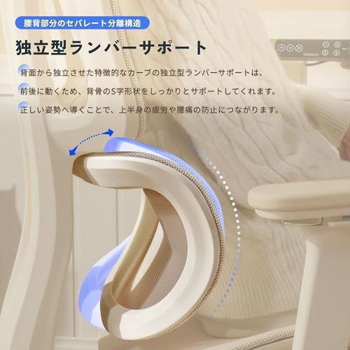 【独立型ランバーサポート】背面から独立させた特徴的なカーブの独立型ランバーサポートは、前後に動くため、背骨のS字形状をしっかりとサポートしてくれます。正しい姿勢へ導くことで、上半身の疲労や腰痛の防止につながります。