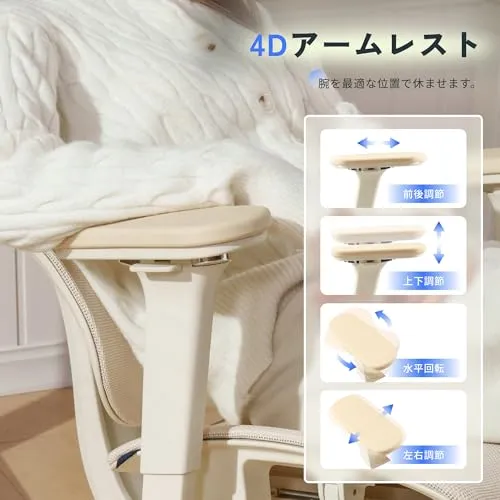 【4Dアームレスト・2Dヘッドレスト】4Dアームレストは上下・前後・左右・水平回転の調節でき、腕を最適な位置で休ませます。2Dヘッドレストは高さと角度を快適なポジションに調節が可能。どんなシチュエーションでも、自分に合った最適な姿勢で座ることができます。