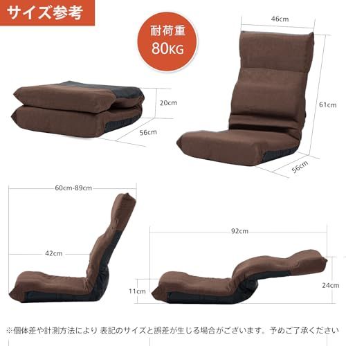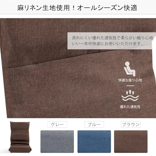 【商品基本スペック】素材:鉄、ウレタン、麻リネン布(マイクロファイバー)。座椅子の外寸サイズ:幅46cm奥行56cm高さ61cm 。座面サイズ:座面の幅46座面の奥行42座面の高さ11cm 。折り畳みサイズ:幅46cm奥行56cm高さ20cm。重量:約3.1kg。耐荷重:約80kg。フラットサイズ:幅46cm奥行92cm高さ24cm。ご注意:フルフラットできません。