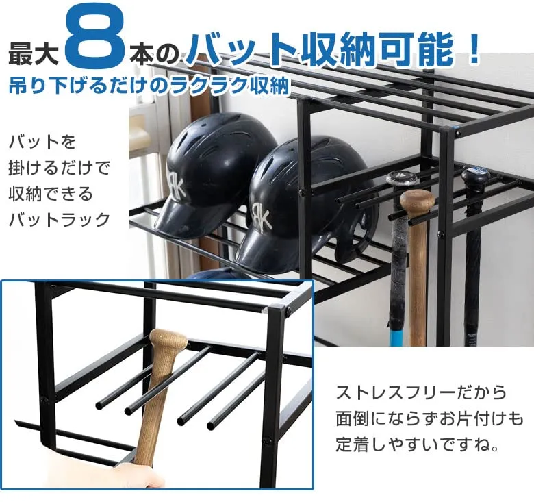 【便利な4段ラック】野球道具(シューズ、グローブ、ヘルメット)全般収納可能です。※バットの吊り下げ部分の間隔:約3cm