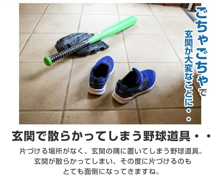 【サイズ】幅90cm高さ112奥行き30 お子様も使いやすい構造:道具を掛ける・置くだけの簡単設計で、お片付け習慣の定着にも効果的。 頑丈なスチール製フレーム:安定感があり、野球道具をしっかり支える安心設計。