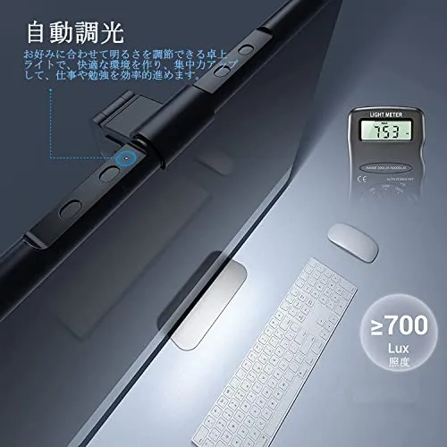 自動調光機能・自然光に近い色を再現: Quntisモニターライトはパソコンのディスプレイに引っ掛けて設置するだけで、手元を明るくすることができる。電源を入れ、無段階輝度調整ボタンをタッチすると、周囲の明るさを検知して自動で光量を調整する自動調光モードになる。照明の明るさを自分の好みや環境に合わせて変更でき、眼の負担を軽減し、快適な視聴環境を提供することができます。*光センサーライトを遮らないでください。
