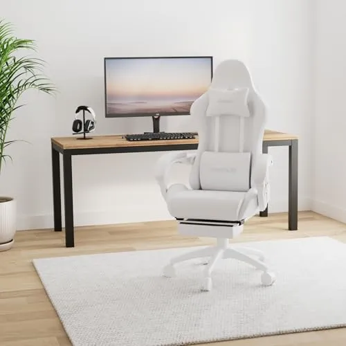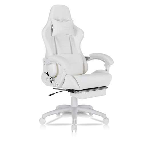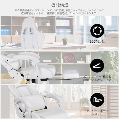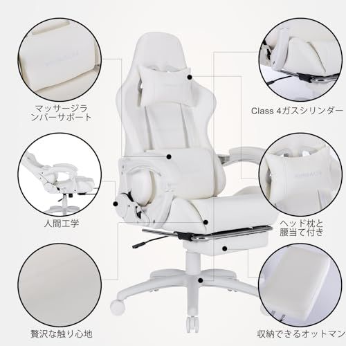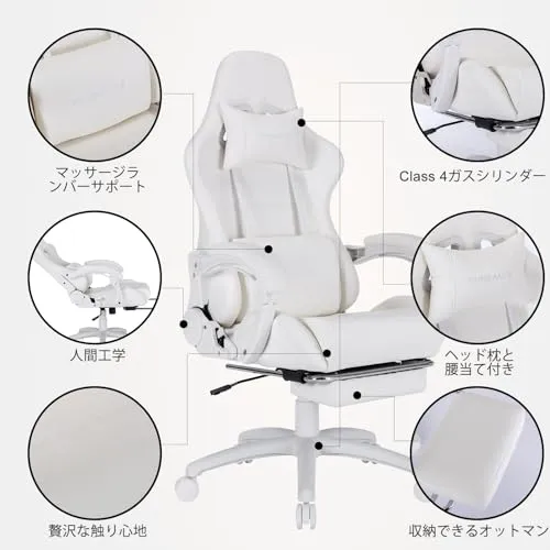 ゲーミングチェア Homracerオフィスチェア パソコンチェア デスクチェア リクライニング PCゲーミングチェア オットマン付き 振動機能ランバーサポート 連動アームレスト 調節可能 業務用 昇降可能 テレワーク 椅子 プレゼント(ホワイト)/