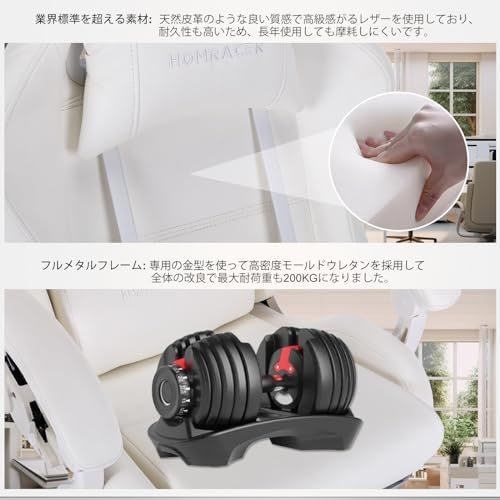 「業界標準を超える・プレミアム素材」プレミアムPUレザー を採用し高級感を保つ時に手触りもスムーズに感じさせられます。臭い匂いがしなくて、耐久性も高いです。背もたれと座敷には厚さ5インチの高品質スポンジを使用し通気性が高くなり、耐久性も高いため、長年使用しても摩耗しにくいです。本体はフルメタルフレームを採用し、ガスシリンダーも業界最高規格のクラス4にアップデートし、業界最高規格のシリンダーとも言えます。全体の革新で最大耐荷重も200KGになりました。