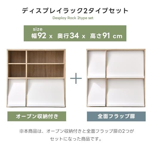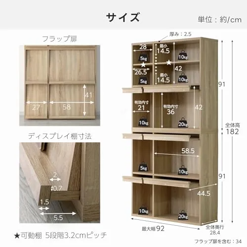 【内寸】オープン部(大)(約)幅58.5x奥行き27x高さ42.5cmオープン部(小)(約)幅28x奥行き27x高さ42.5cm フラップ部(大)(約)幅58.5x奥行き22.5x高さ36cm フラップ部(小)(約)幅28x奥行き22.5x高さ36cm 商品重量 1.(約)17kg、 2.(約)18kg 梱包サイズ(2個) 1.(約)幅95cm奥行き45.5cm高さ16.5cm2.(約)幅95cm奥行き45.5cm高さ17cm 梱包重量1.(約)18.5kg 2.(約)19.5kg 材質:プリント化粧繊維版 耐荷重:天板:(約)30kg、フラップ:(約)2kg、可動棚(大):(約)10kg、可動棚(小):(約)5kg お客様組み立て品:(約) 120分(1人/目安) 必要工具:プラスドライバー(電動工具があれば楽に作業できます)