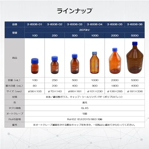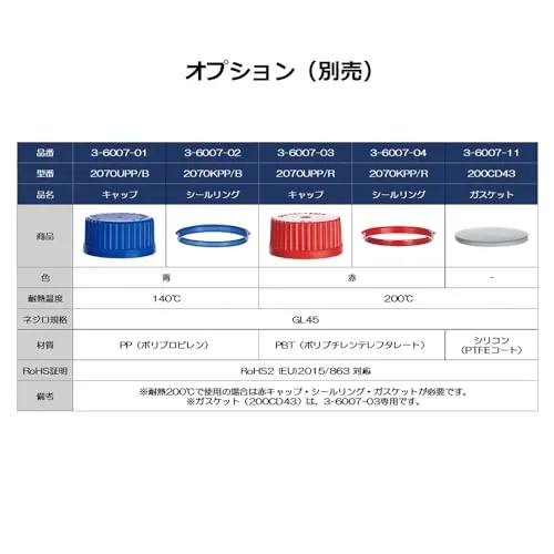 ●材質:本体/硼珪酸ガラス、キャップ・シールリング/PP(ポリプロピレン)