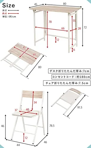 【商品サイズ(約)】デスク:幅80奥行45高さ72cm(折りたたんだ状態の高さ:7cm)/チェア:幅44奥行46高さ78.5cm(折りたたんだ状態の高さ:7.5cm)