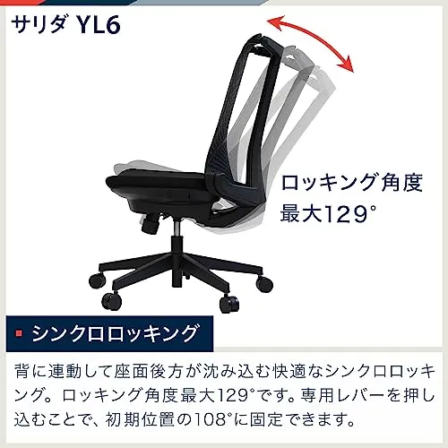 【シンクロロッキング】背に連動して座面後方が沈み込む快適なシンクロロッキング。ロッキング角度最大129です。専用レバーを押し込むことで、初期位置の108に固定できます。