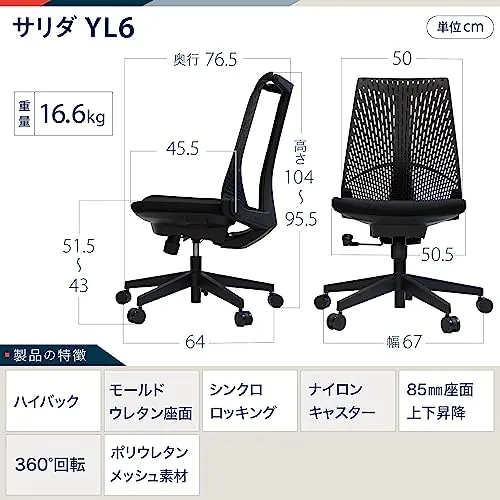 イトーキ サリダ YL6 ブラック オフィスチェア【スタイリッシュデザイン/通気性・メッシュ形状のハイバック/こだわりの座面/シンクロロッキング / 360度回転 / 85mm座面上下昇降 / イトーキ品質 / 3年保証 / お客様組立品】 ゲーミング デス/