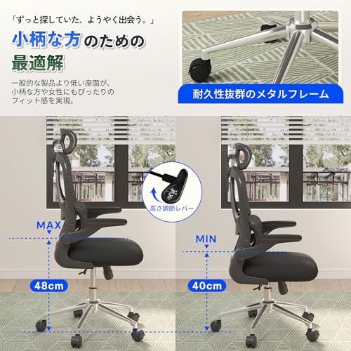 【高さ調節可能&頑丈なメタルフレーム】座面の高さを40cmから48cmの間で自由に調節可能。デスクの高さや体型に合わせて、最適な座り姿勢を簡単にセットできます。さらに、耐久性抜群のメタルフレームを採用。安定感があり、長期間の使用にも耐える頑丈な設計です。