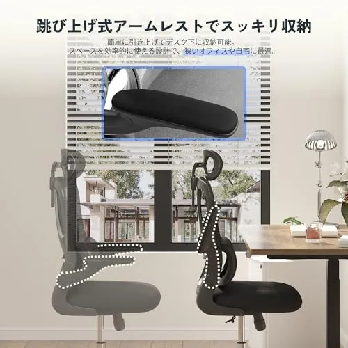 【跳び上げ式アームレストでスッキリ収納】この椅子は、簡単に引き上げてデスク下に収納できるため、スペースを効率的に使えます。さらに、アームレストの表面にはソフトクッションを採用。肘を置いた時のフィット感と快適さを実現。コンパクトさと使いやすさを兼ね備え、狭いオフィスや自宅のワークスペースにぴったりのチェアです!