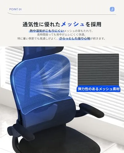 【肉厚クッション&メッシュバックで快適サポート】このオフィスチェアは、7.5cmの高密度スポンジクッションを採用し、座り心地の良さを徹底追求。長時間座っても疲れにくく、お尻や太ももへの負担を軽減します。さらに、背もたれには弾力性のあるメッシュ素材を使用。通気性が抜群で、蒸れにくく快適な座り心地を実現します。