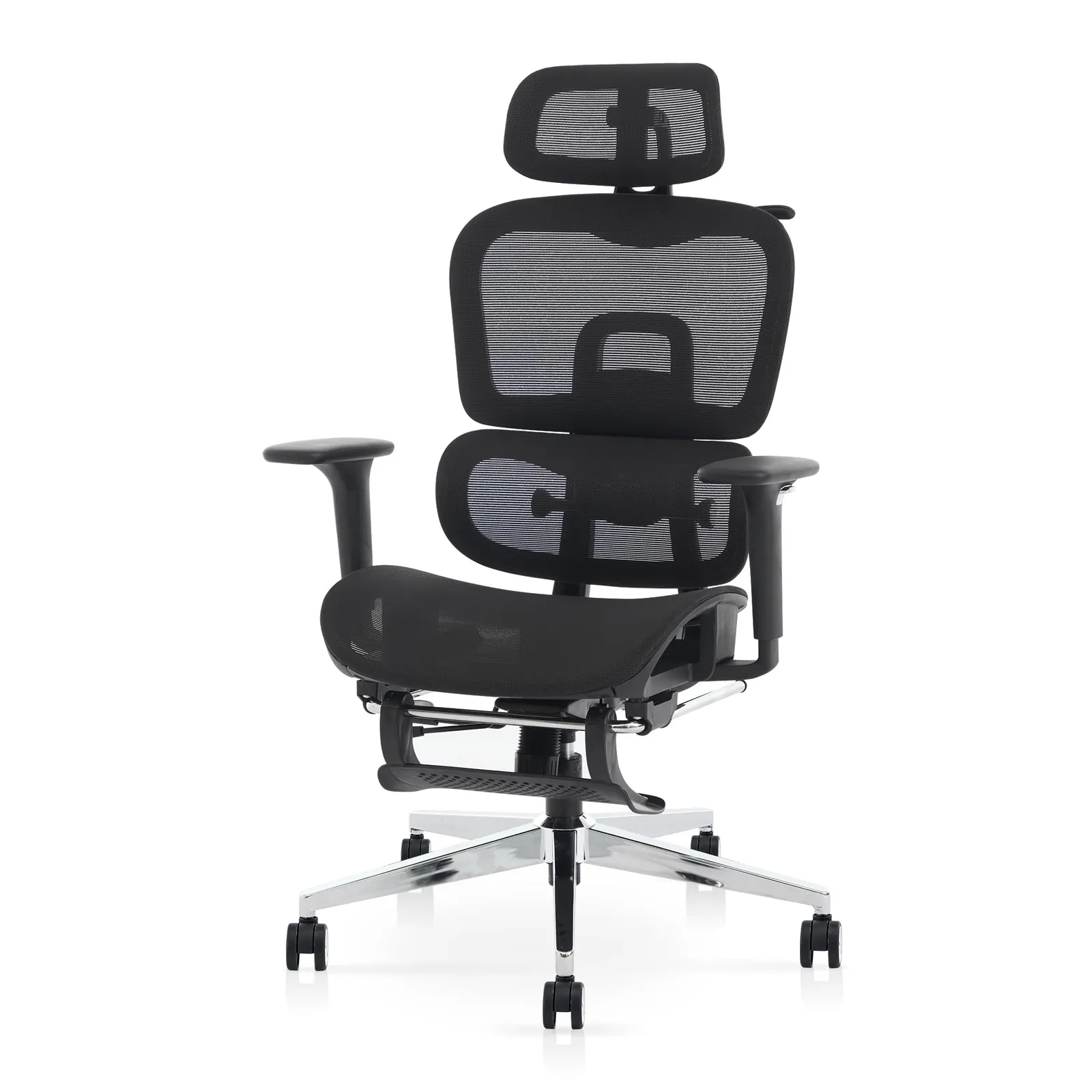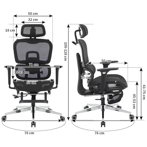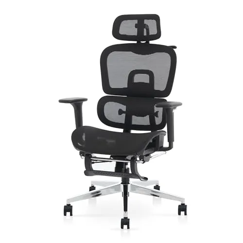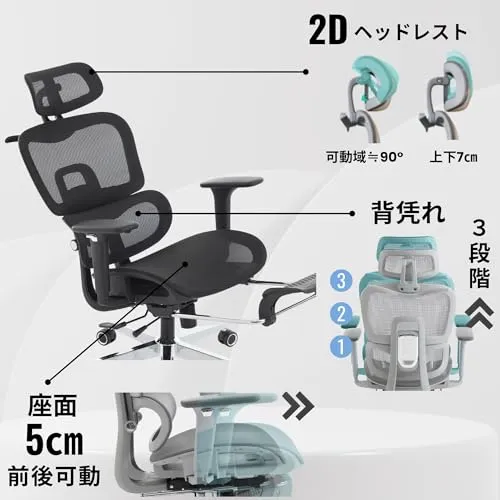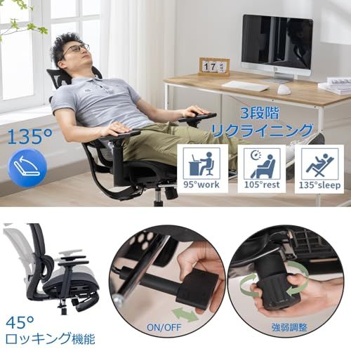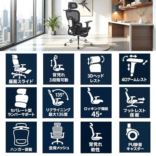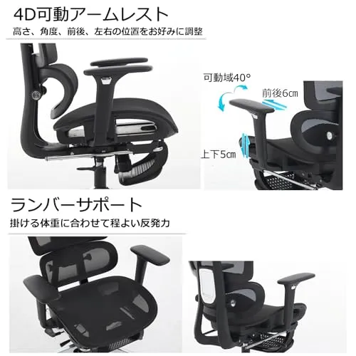 【機能】長時間の作業をサポートする機能を多数搭載。リクライニング、ロッキング機能、背凭れと座面奥行が調整可能、腰が楽になるランバーサポート、腕をサポートする4Dアームレスト、フットレスト・ヘッドレスト付き