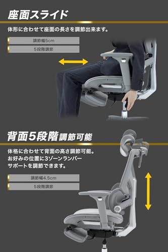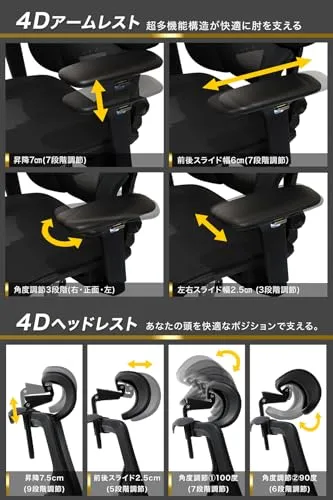 【充実した多機能設計】?「4Dアームレスト」昇降7、角度調節3段階、前後スライド幅6、左右スライド幅2.5 肘をお好みの位置で快適に支えます。?「4Dヘッドレスト」角度調節1:調節幅100度、角度調節2:調節幅90度、前後スライド2.5cm、高さ調節7.5cm可能。?夏場も蒸れにくい全身メッシュ構造(フットレスト除く)。?静かで滑らかな滑りのPUキャスター搭載。