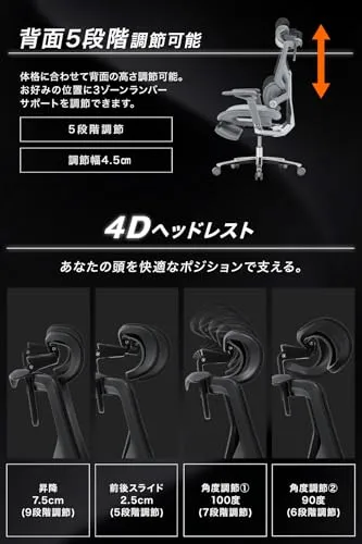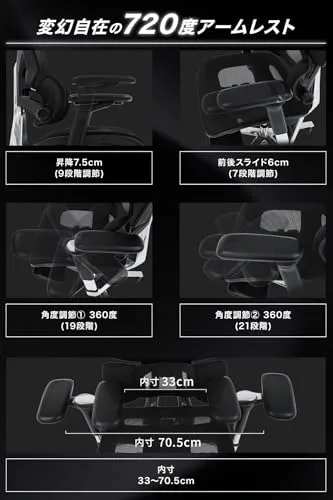 【充実した多機能設計】?「変幻自在の360度アームレスト」昇降6.5、角度調節3段階、前後スライド幅5.5、左右スライド幅4.5 肘をお好みの位置で快適に支えます。?「2Dヘッドレスト」3段階角度調節可能、高さ調節8可能。?滑らかな滑りのPUキャスター搭載。